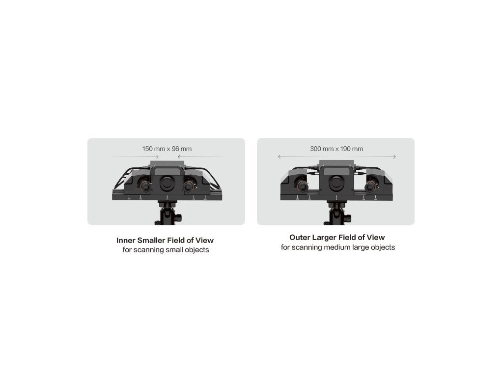 - Nastaviteľný rozsah skenovania, ktorý vyhovuje potrebám rôznych veľkostí a zložitých objektov.